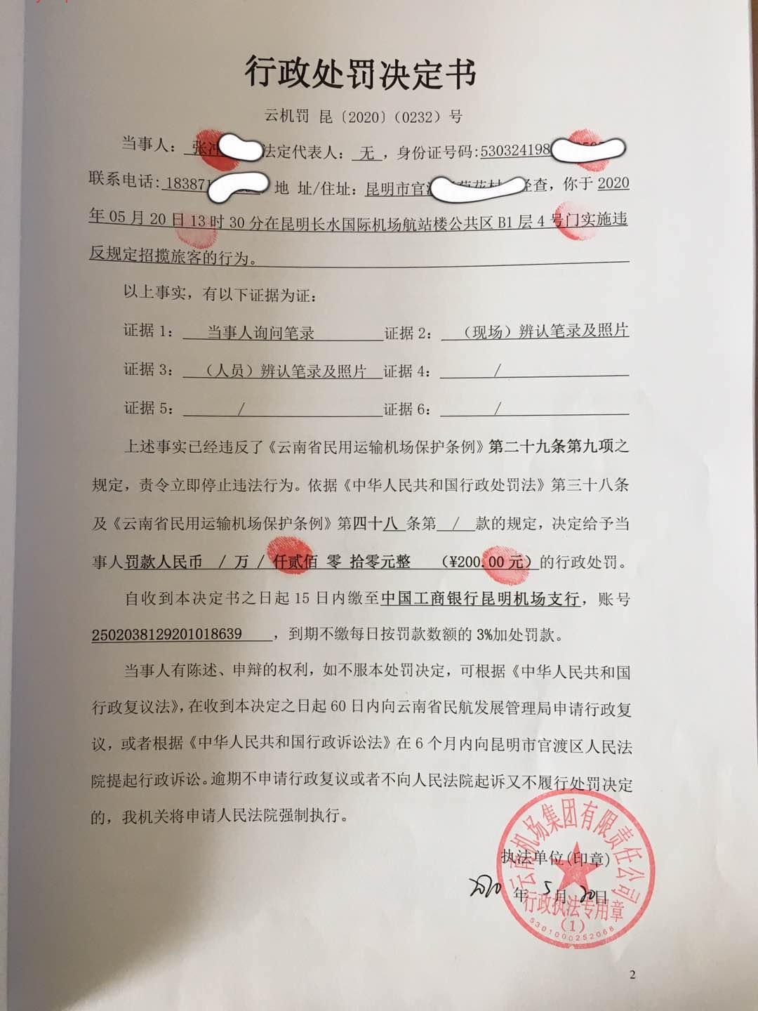 行政处罚决定书 云机罚 昆{2020} (0232)号