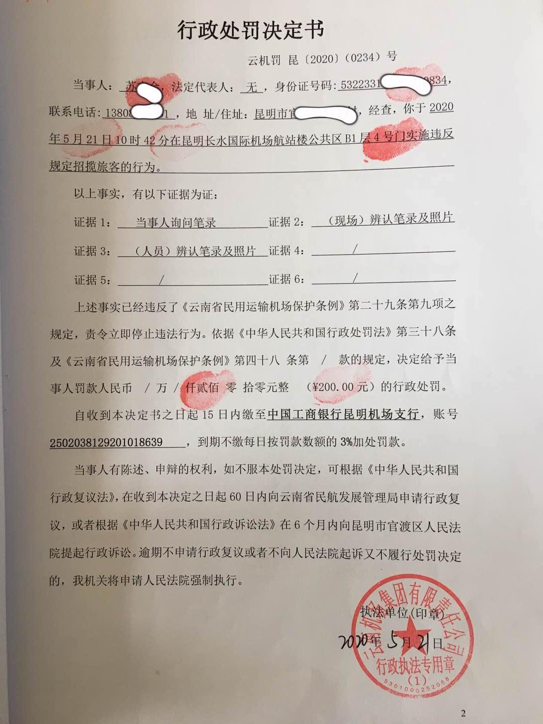 行政处罚决定书 云机罚 昆{2020} (0235)号