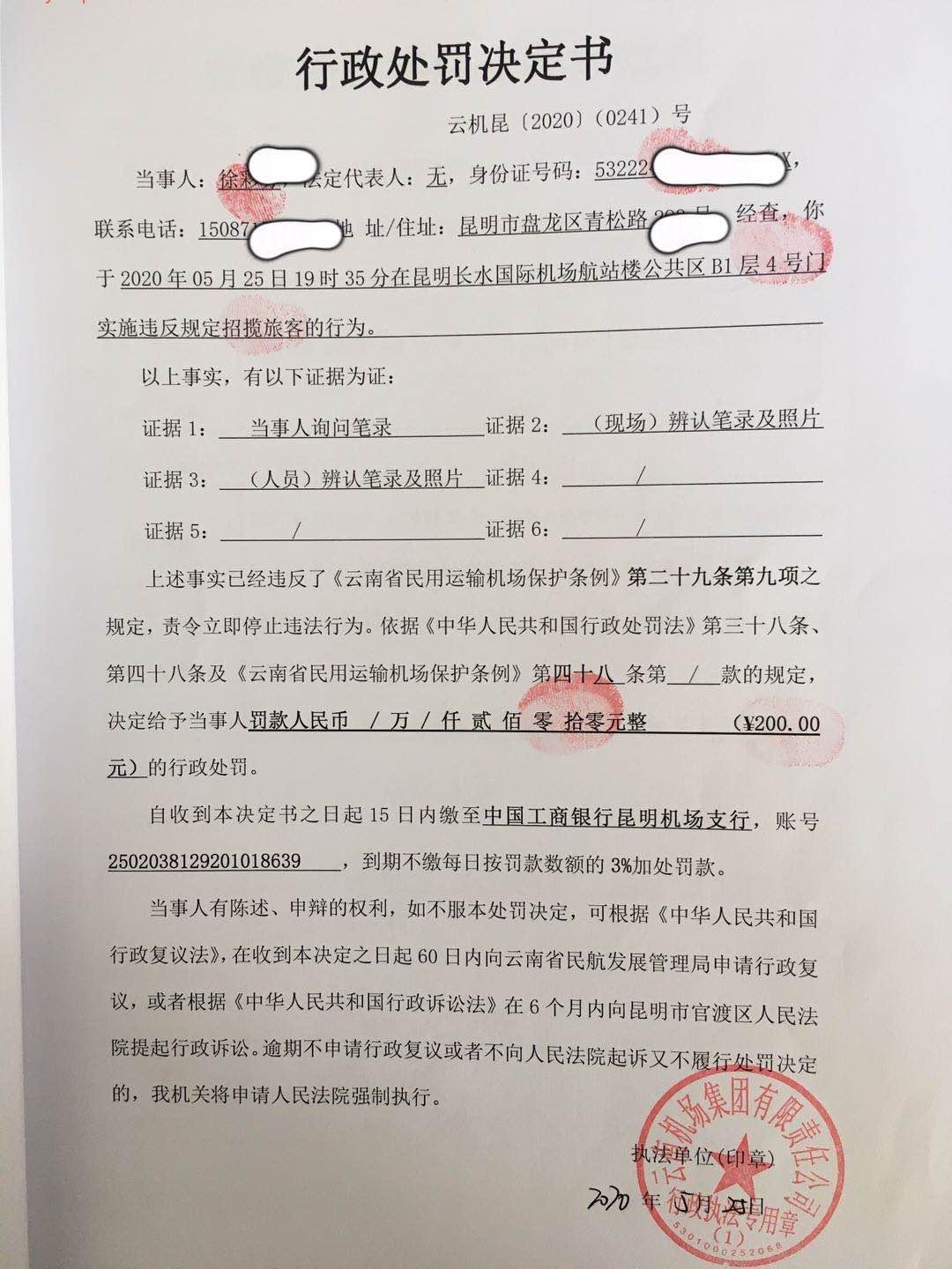 行政处罚决定书 云机罚 昆{2020} (0240)号