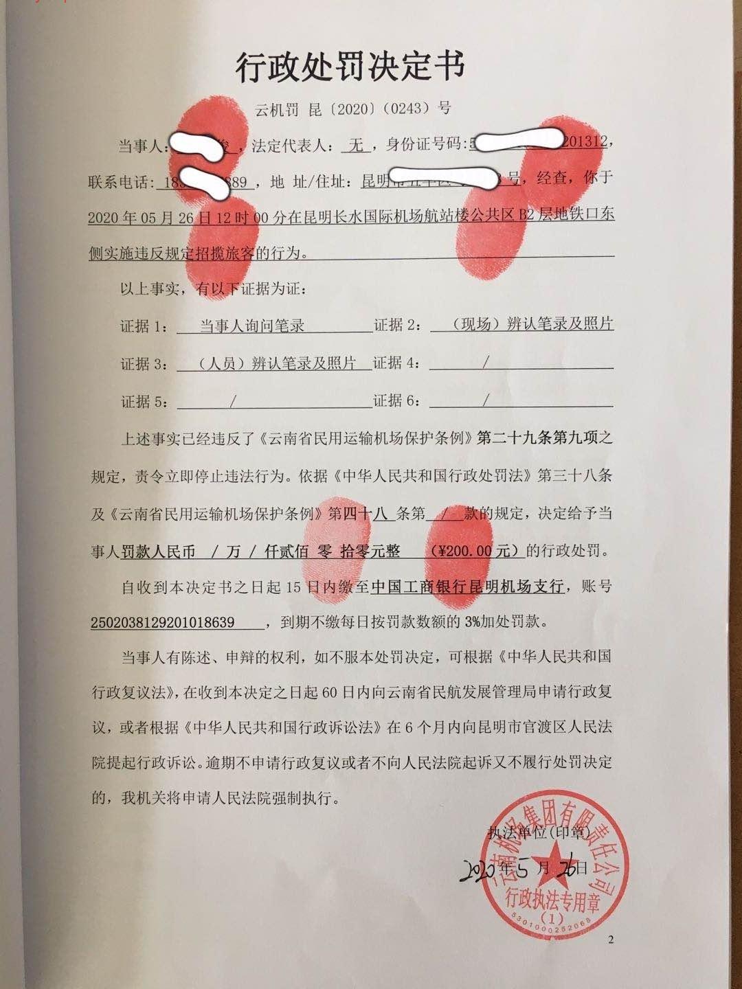 行政处罚决定书 云机罚 昆{2020} (0243)号