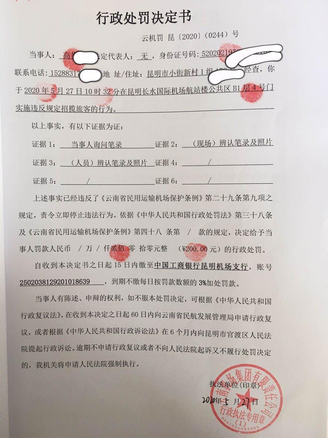 行政处罚决定书 云机罚 昆{2020} (0243)号