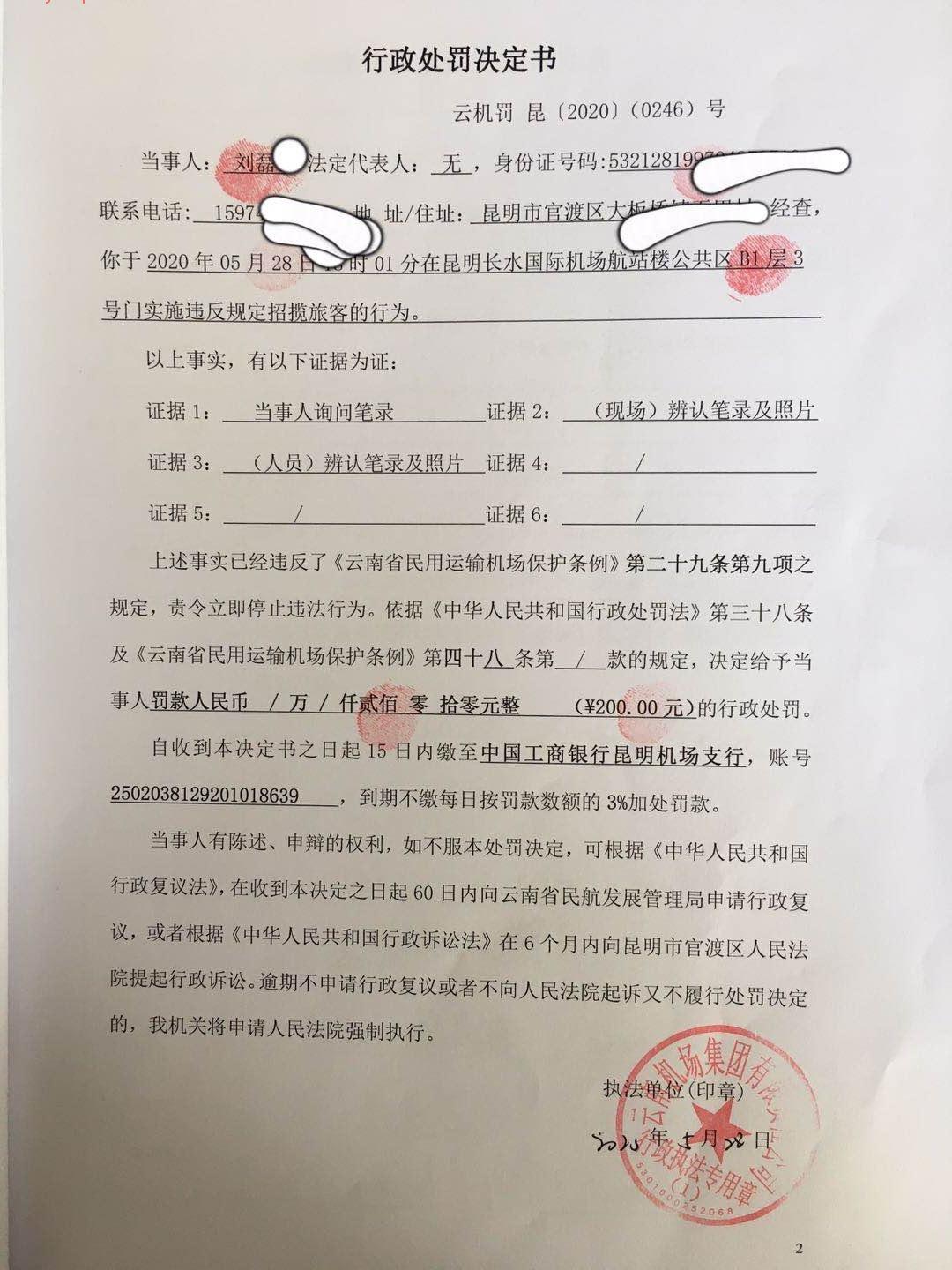 行政处罚决定书 云机罚 昆{2020} (0247)号