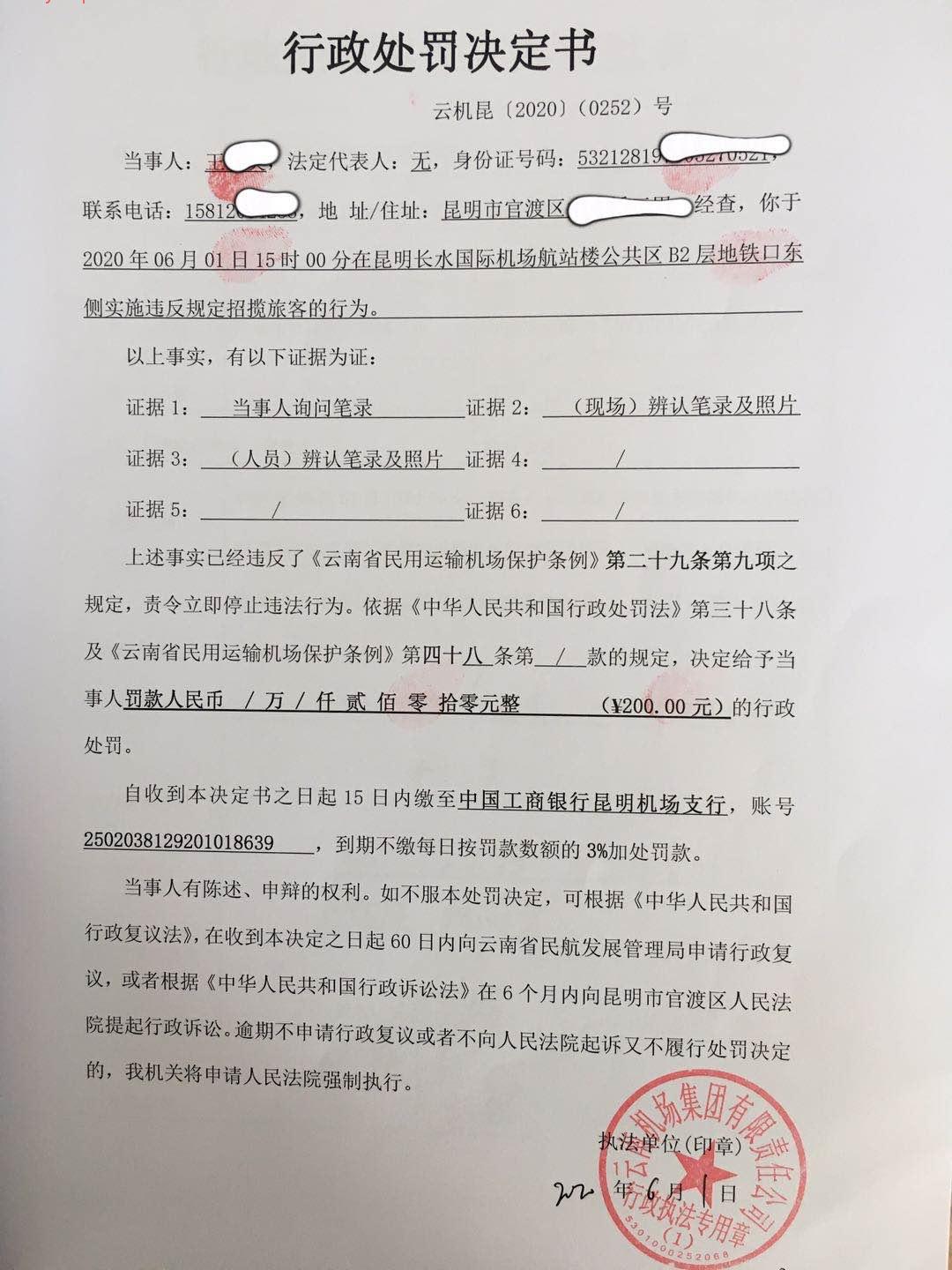 行政处罚决定书 云机罚 昆{2020} (0253)号