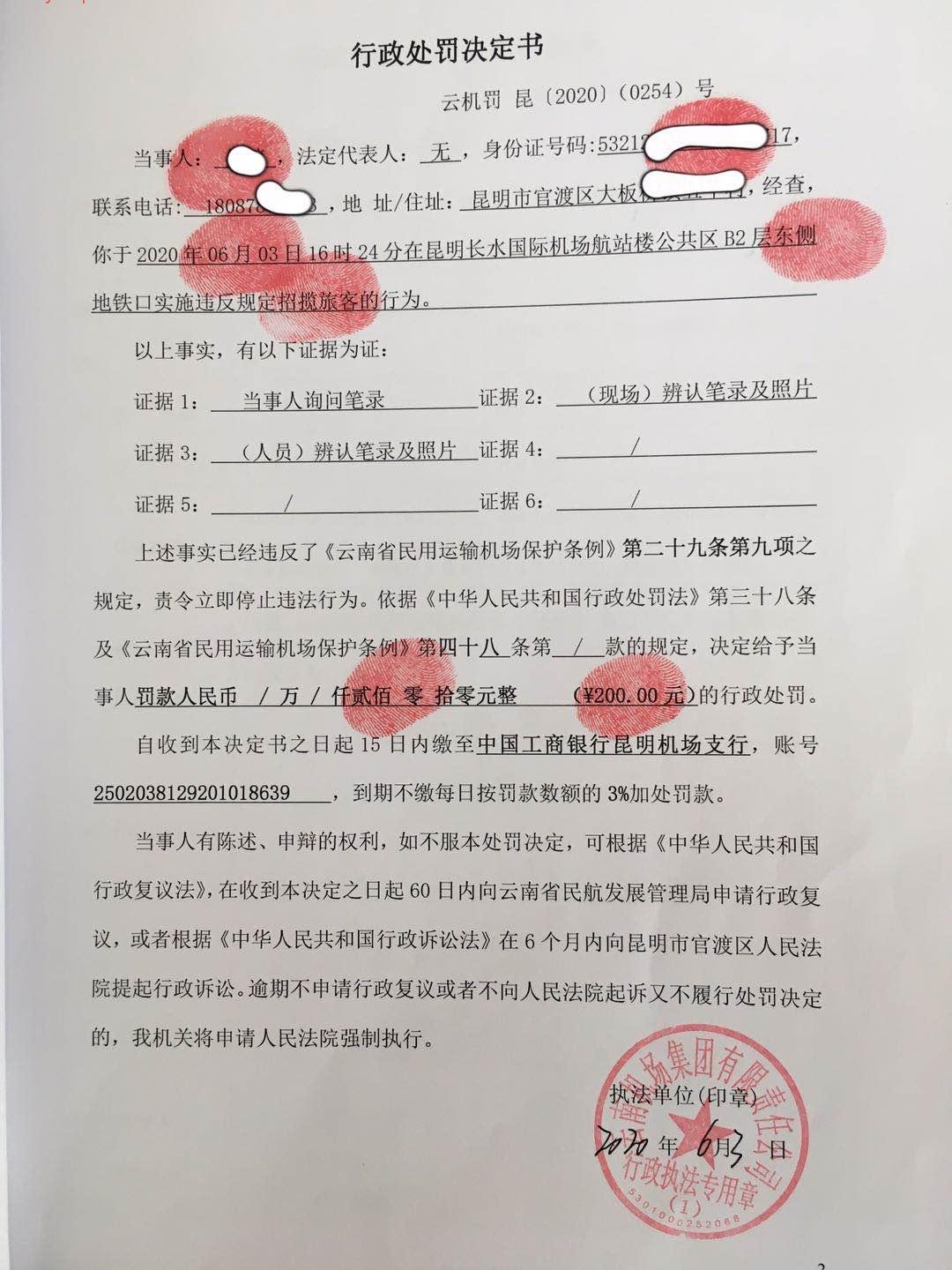 行政处罚决定书 云机罚 昆{2020} (0254)号