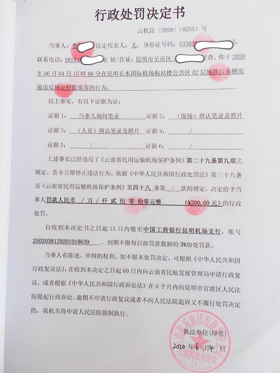 行政处罚决定书 云机罚 昆{2020} (0255)号