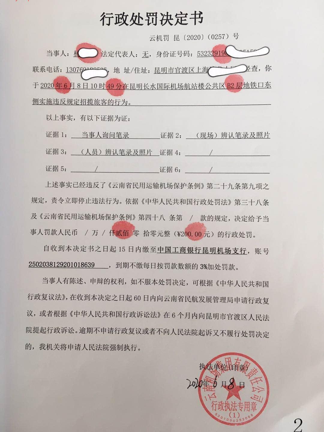 行政处罚决定书 云机罚 昆{2020} (0257)号