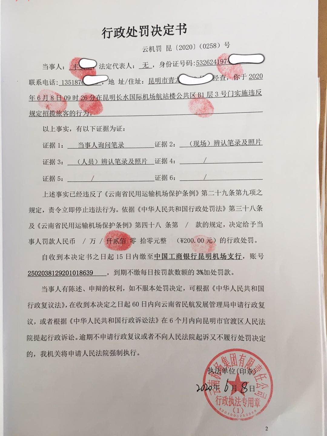 行政处罚决定书 云机罚 昆{2020} (0258)号