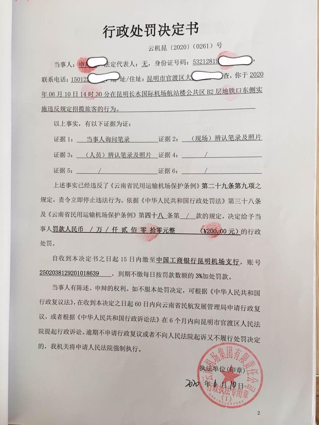 行政处罚决定书 云机罚 昆{2020} (0260)号
