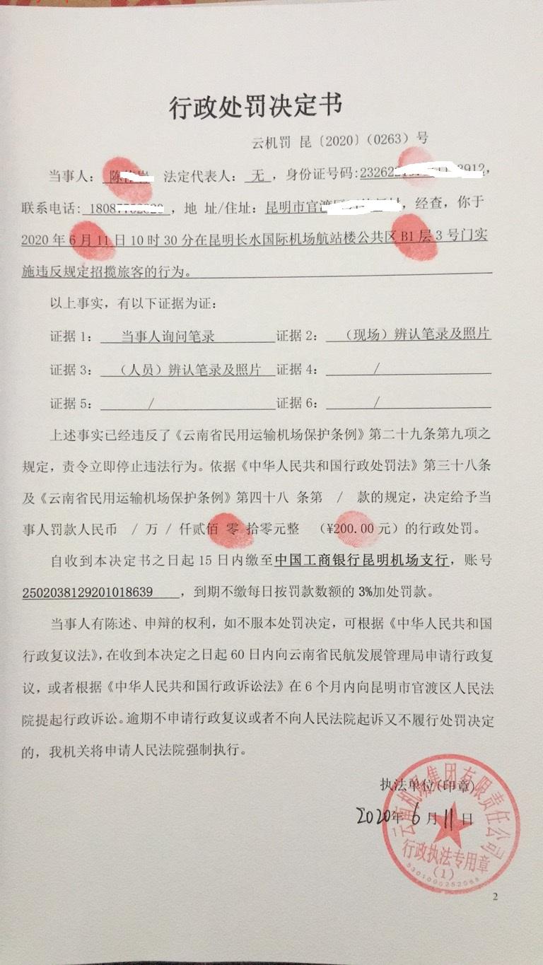行政处罚决定书 云机罚 昆{2020} (0262)号