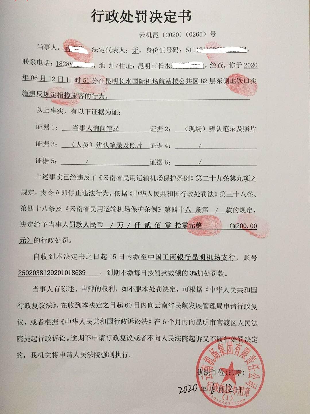 行政处罚决定书 云机罚 昆{2020} (0265)号