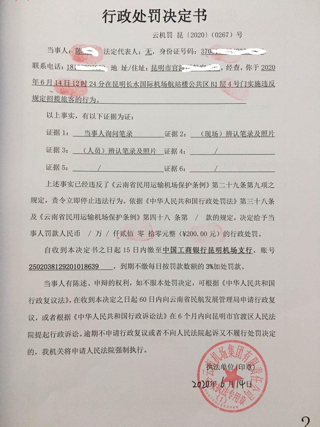 行政处罚决定书 云机罚 昆{2020} (0268)号