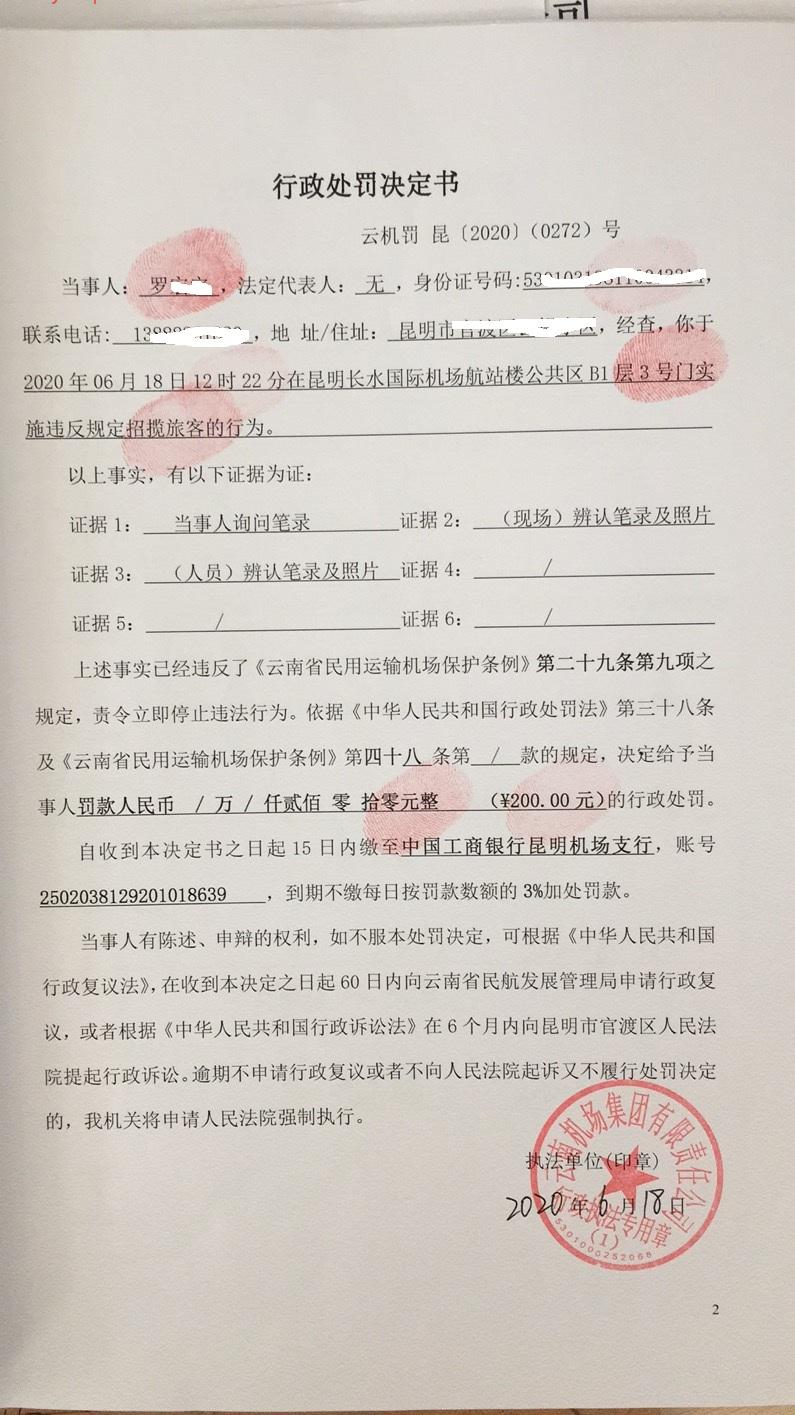行政处罚决定书 云机罚 昆{2020} (0273)号