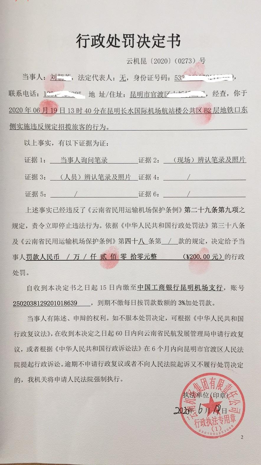 行政处罚决定书 云机罚 昆{2020} (0273)号