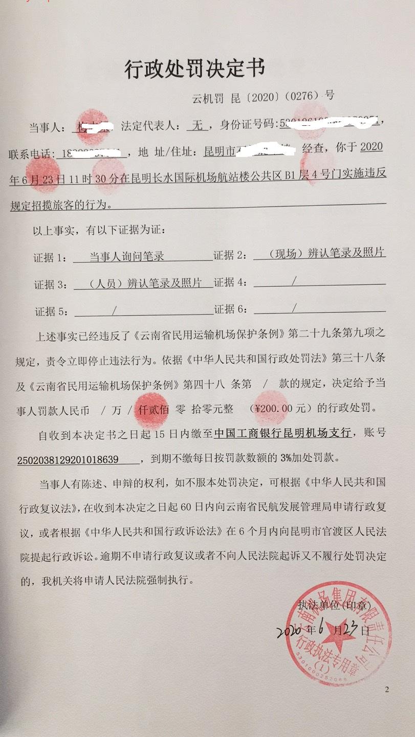 行政处罚决定书 云机罚 昆{2020} (0276)号