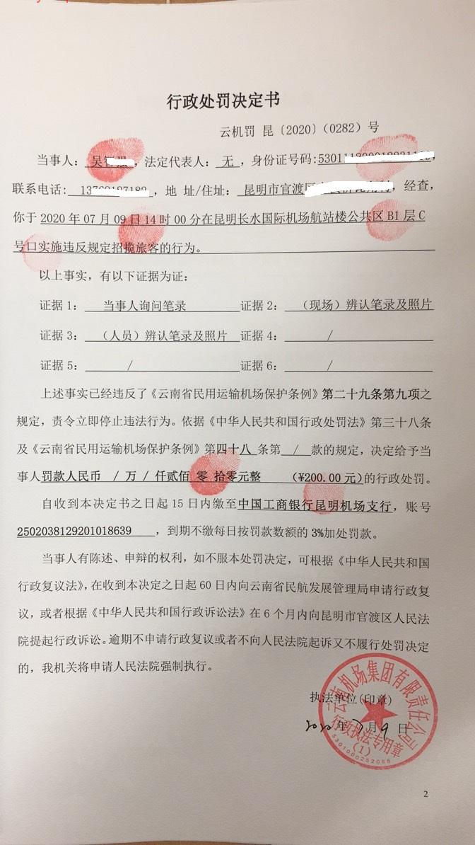 行政处罚决定书 云机罚 昆{2020} (0282)号