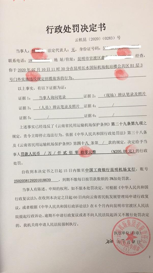 行政处罚决定书 云机罚 昆{2020} (0283)号