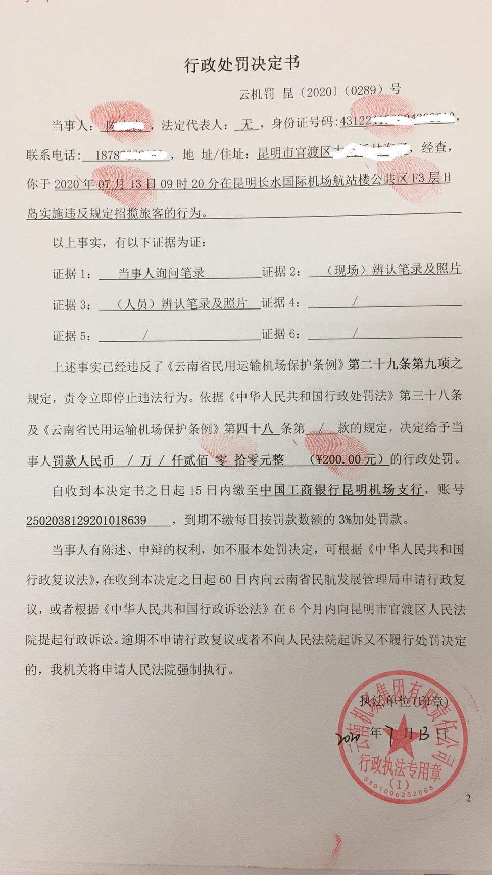 行政处罚决定书 云机罚 昆{2020} (0289)号