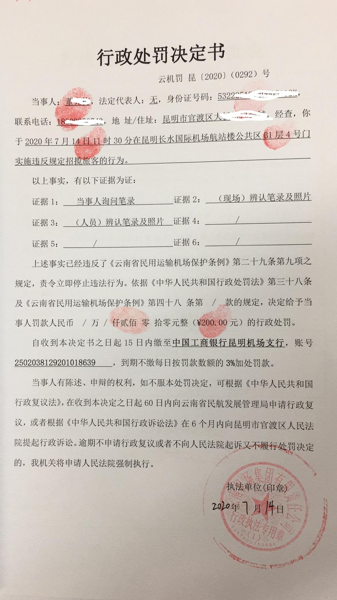 行政处罚决定书 云机罚 昆{2020} (0292)号
