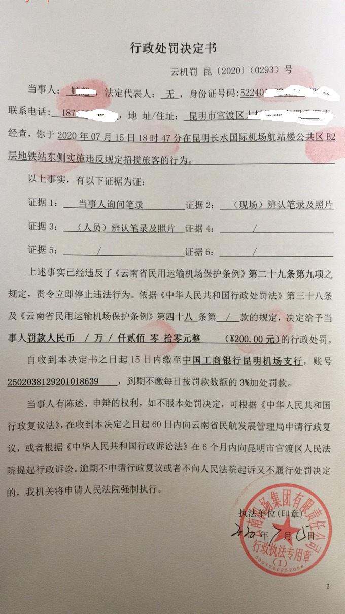 行政处罚决定书 云机罚 昆{2020} (0293)号
