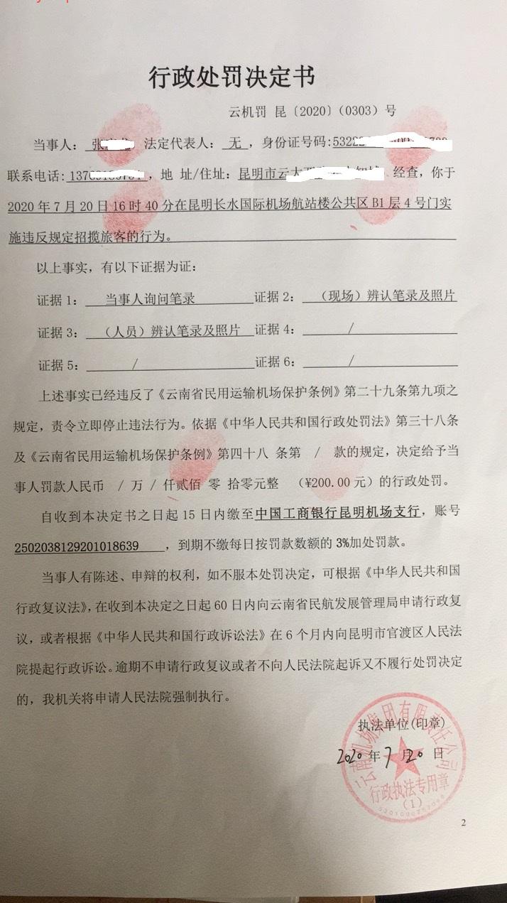 行政处罚决定书 云机罚 昆{2020} (0302)号