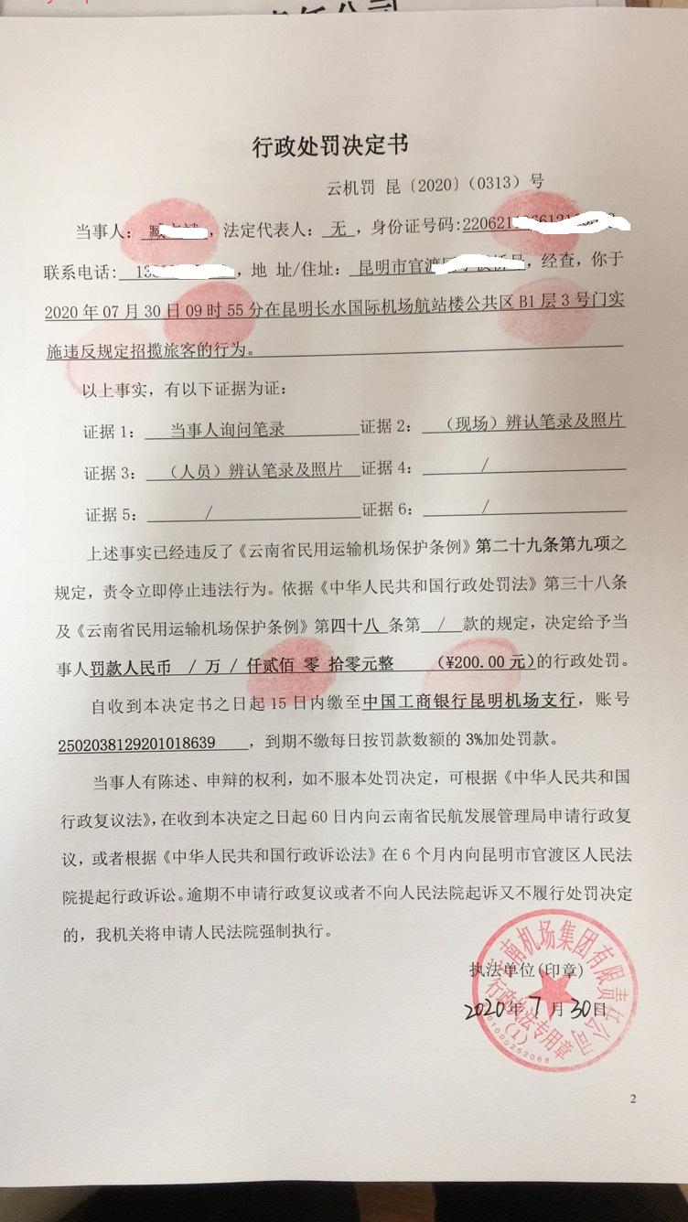 行政处罚决定书 云机罚 昆{2020} (0312)号
