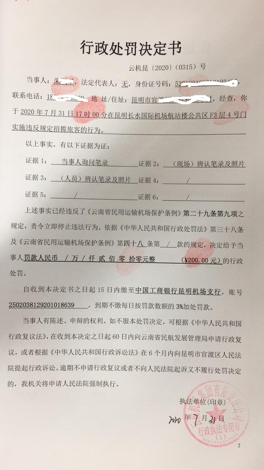 行政处罚决定书 云机罚 昆{2020} (0316)号