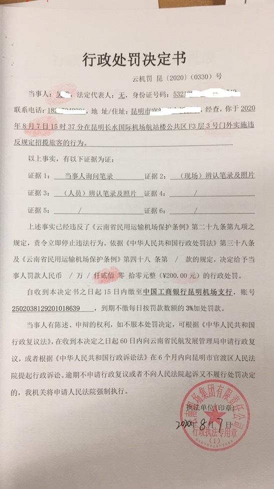 行政处罚决定书 云机罚 昆{2020} (0331)号