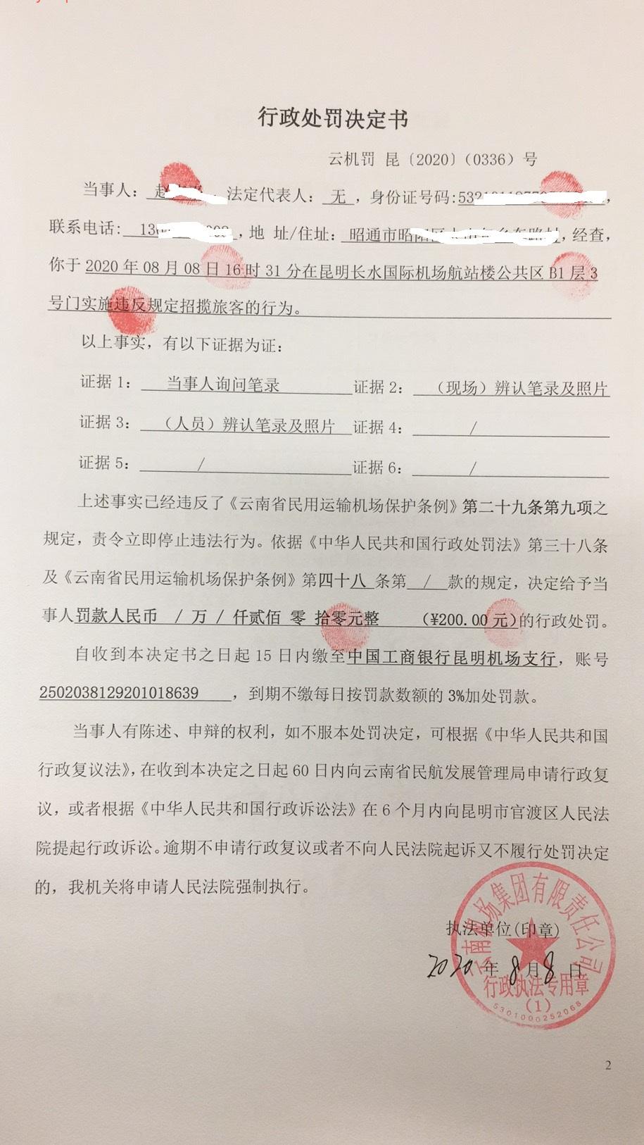 行政处罚决定书 云机罚 昆{2020} (0336)号