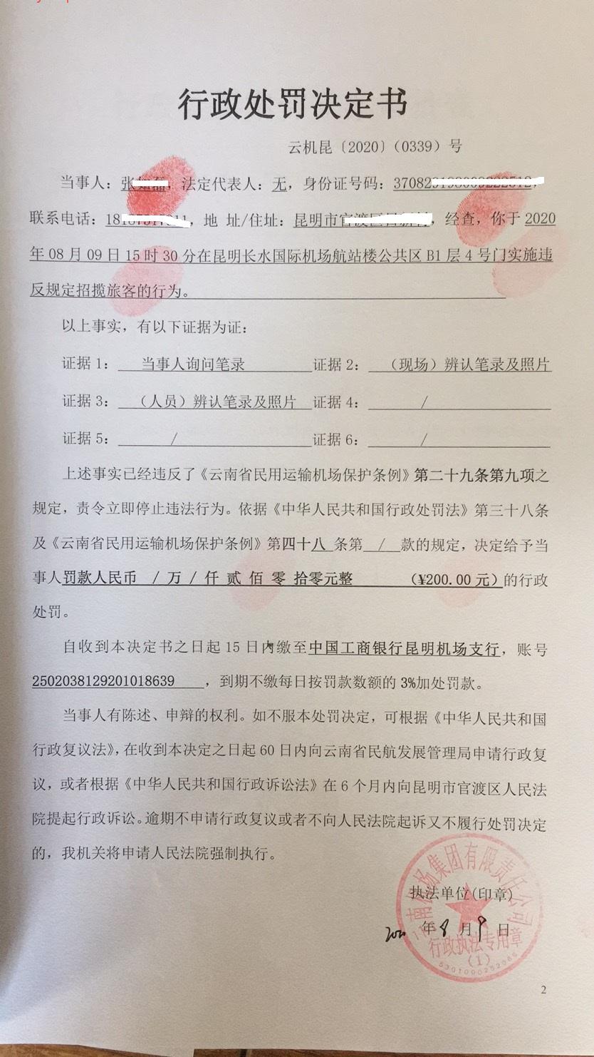 行政处罚决定书 云机罚 昆{2020} (0339)号