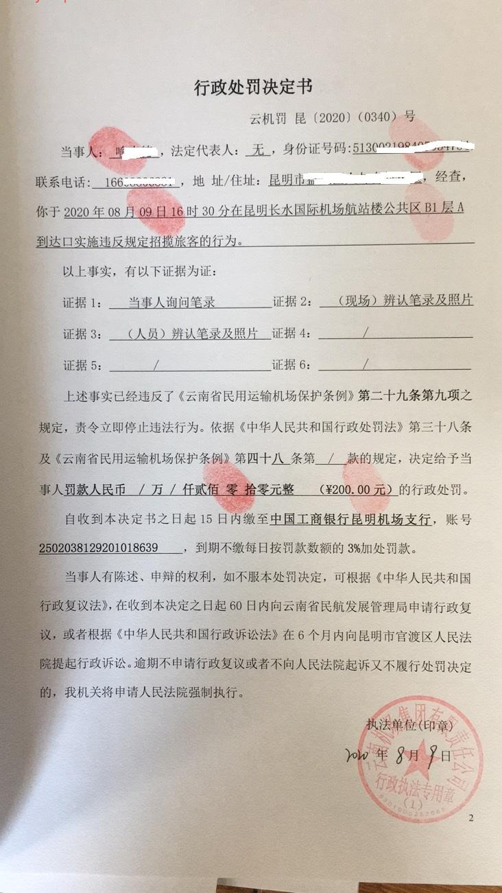 行政处罚决定书 云机罚 昆{2020} (0340)号