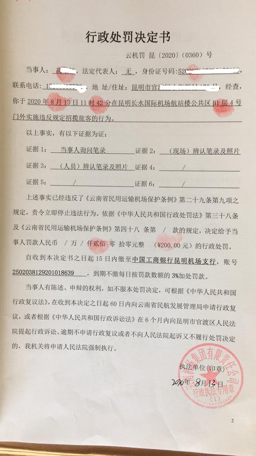 行政处罚决定书 云机罚 昆{2020} (0360)号