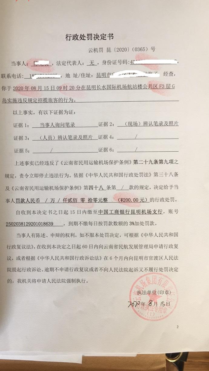行政处罚决定书 云机罚 昆{2020} (0365)号