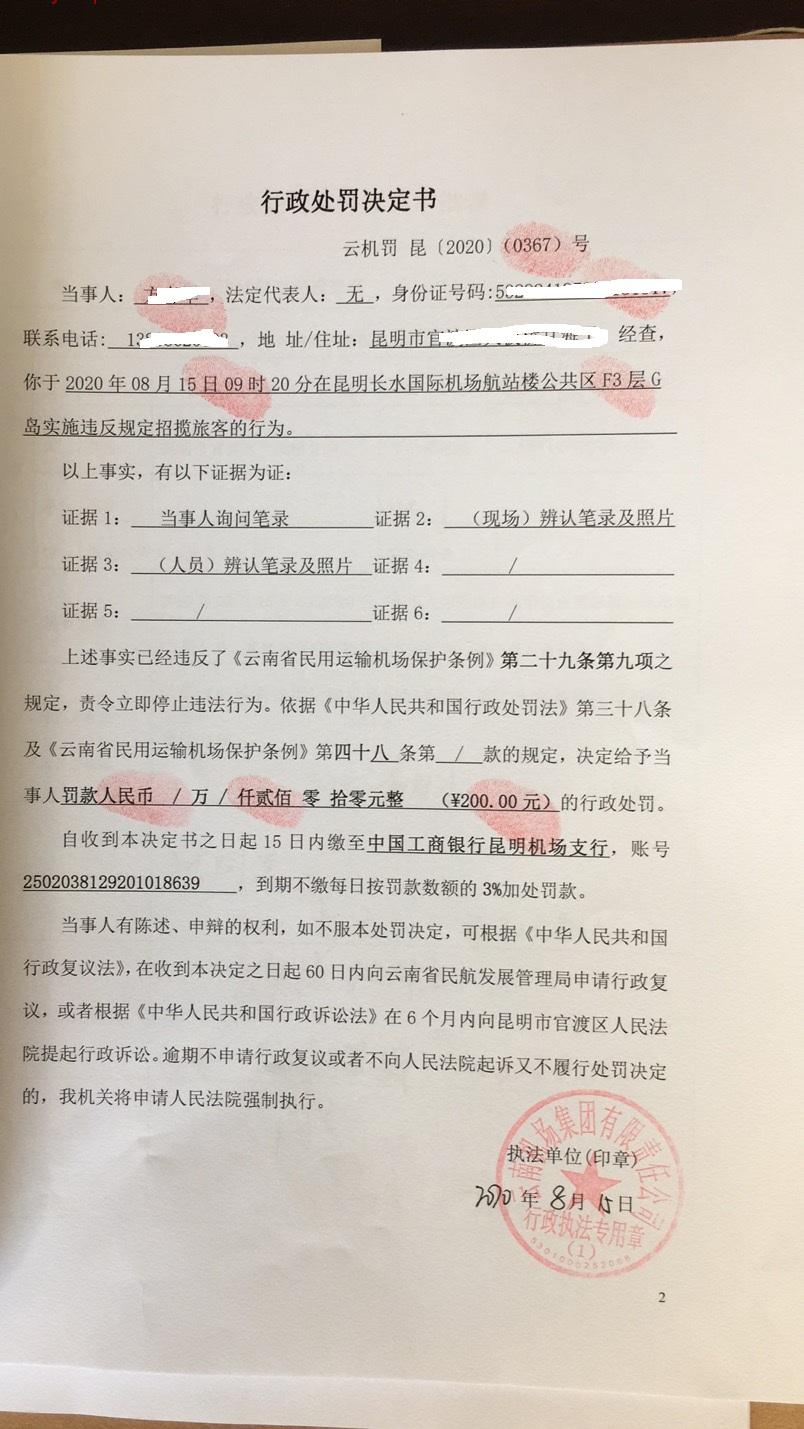 行政处罚决定书 云机罚 昆{2020} (0366)号