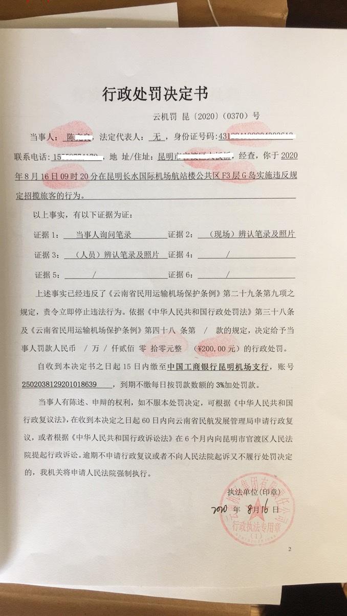 行政处罚决定书 云机罚 昆{2020} (0371)号