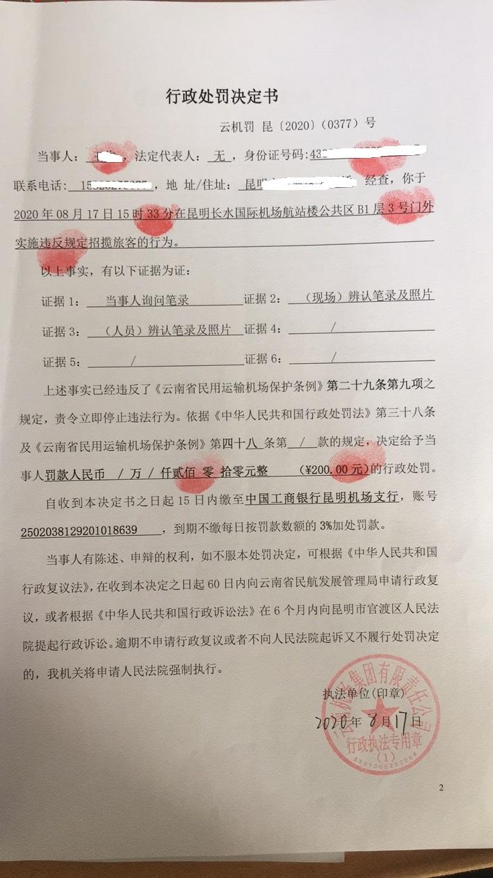 行政处罚决定书 云机罚 昆{2020} (0376)号