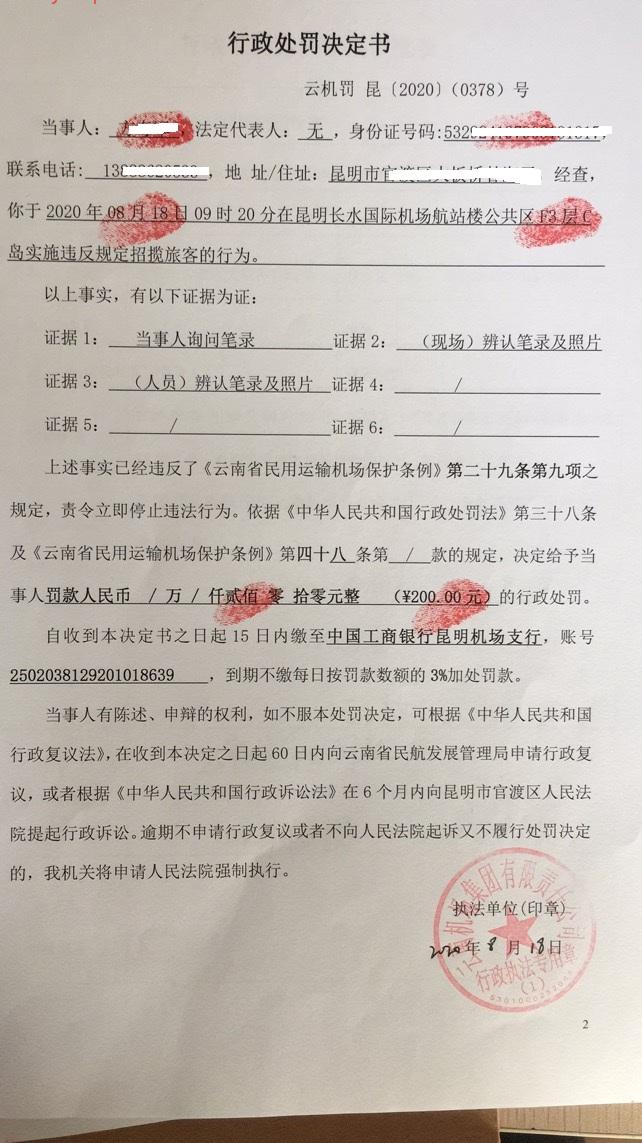 行政处罚决定书 云机罚 昆{2020} (0378)号