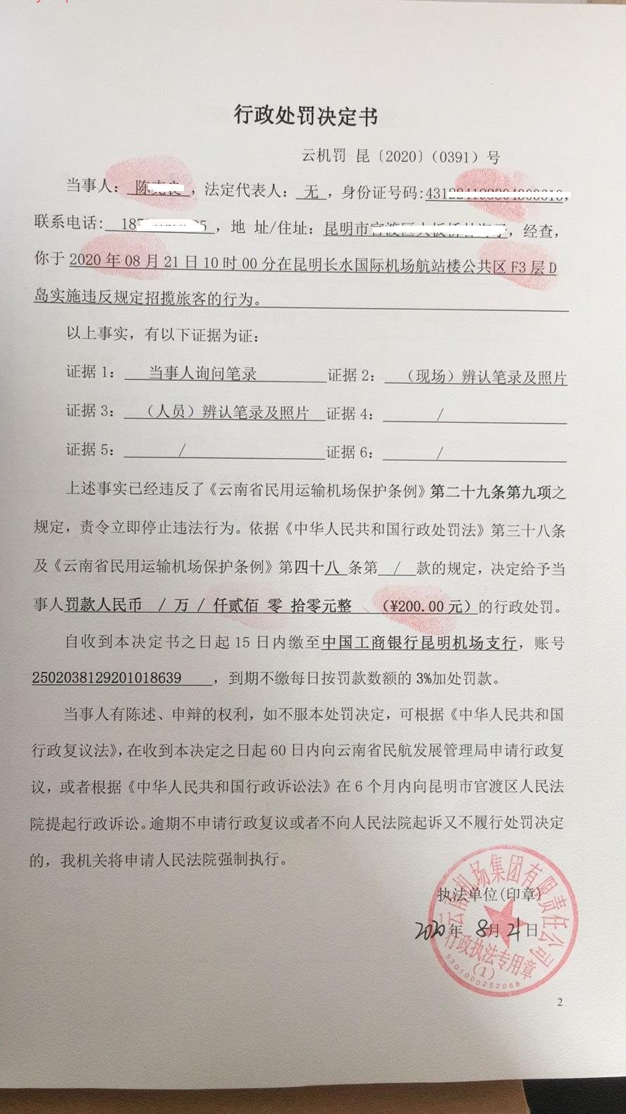 行政处罚决定书 云机罚 昆{2020} (0392)号