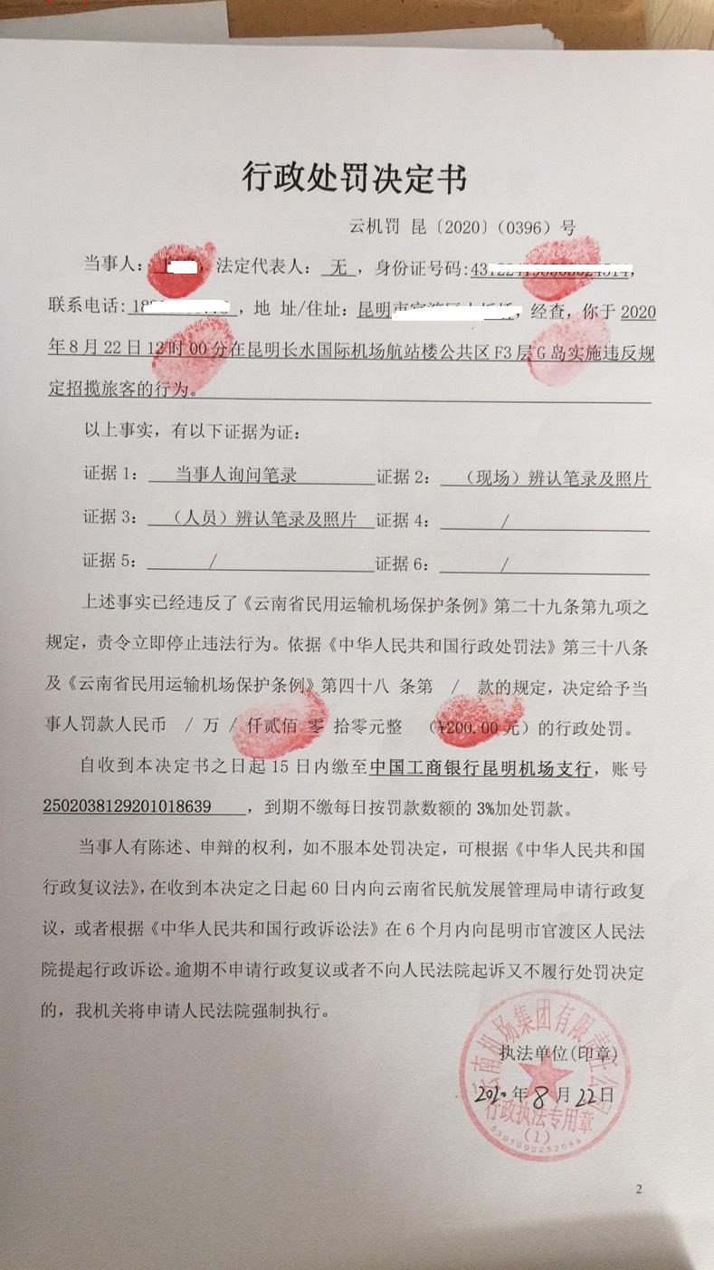 行政处罚决定书 云机罚 昆{2020} (0397)号