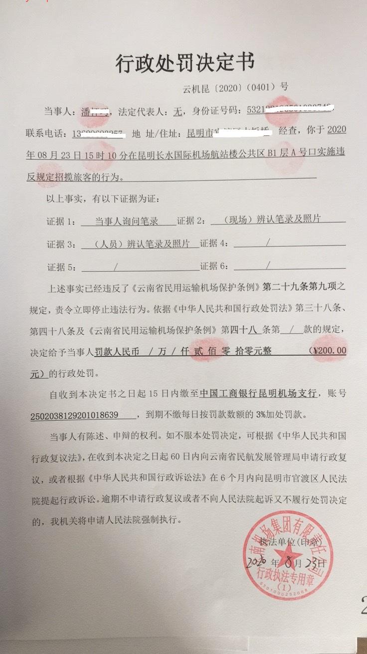 行政处罚决定书 云机罚 昆{2020} (0400)号