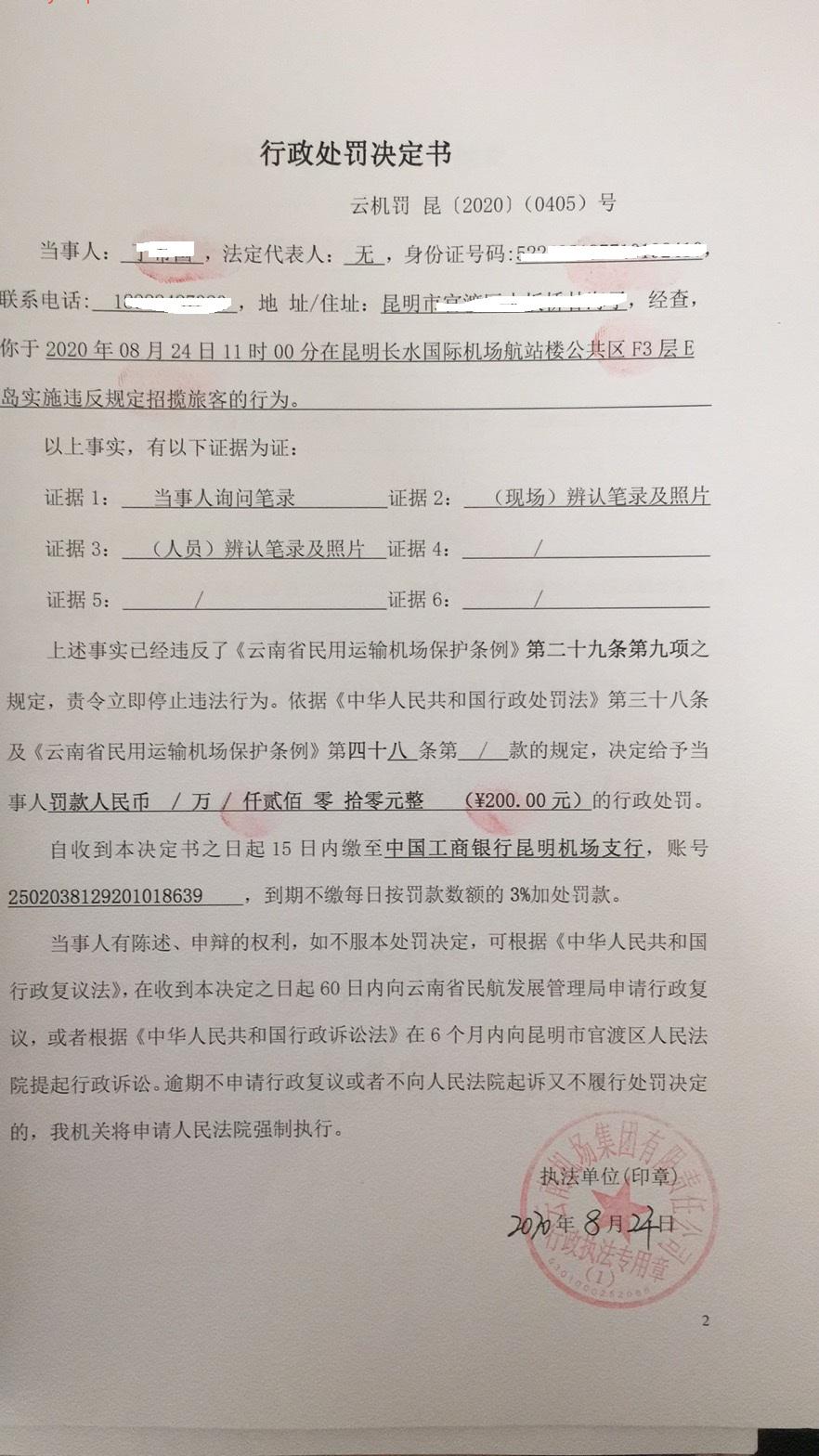 行政处罚决定书 云机罚 昆{2020} (0404)号