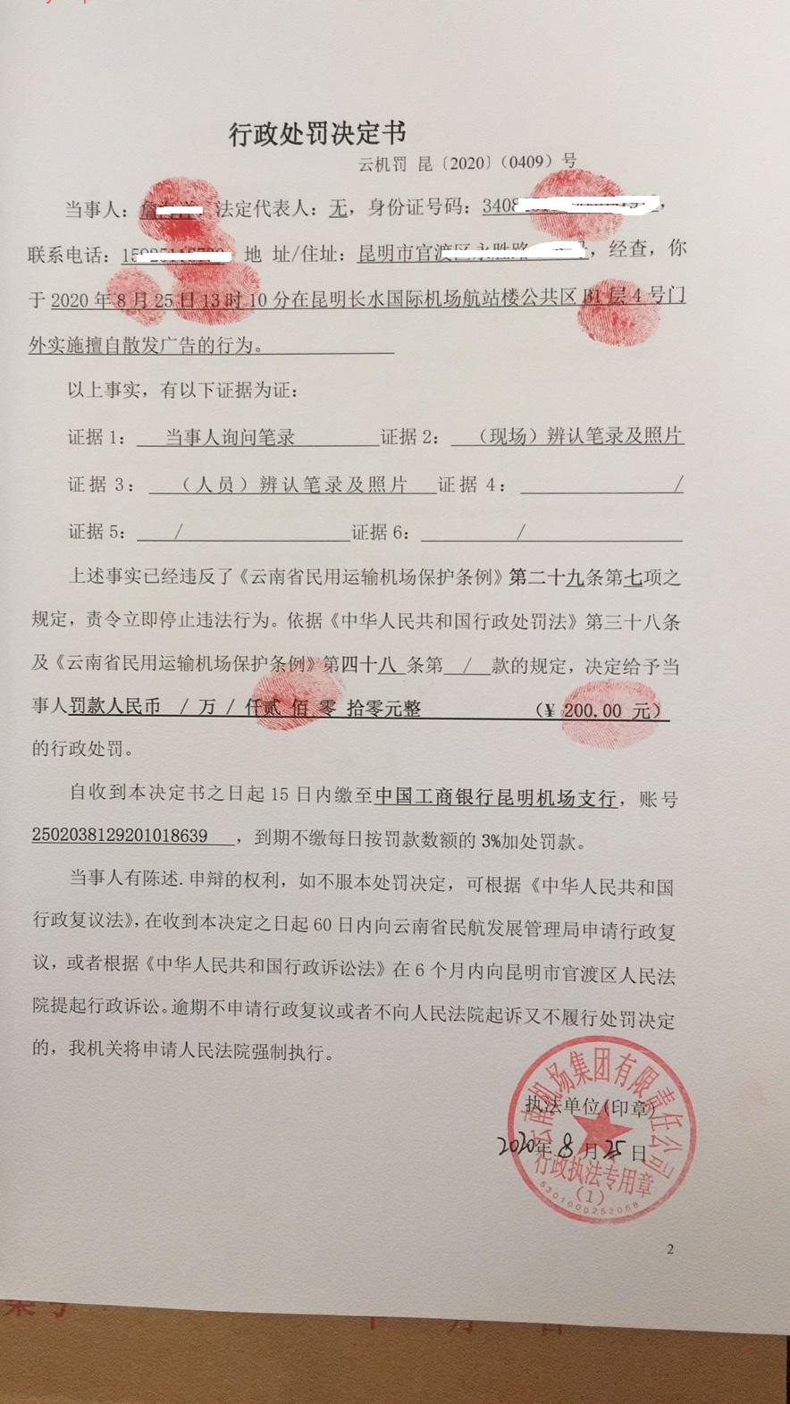 行政处罚决定书 云机罚 昆{2020} (0409)号