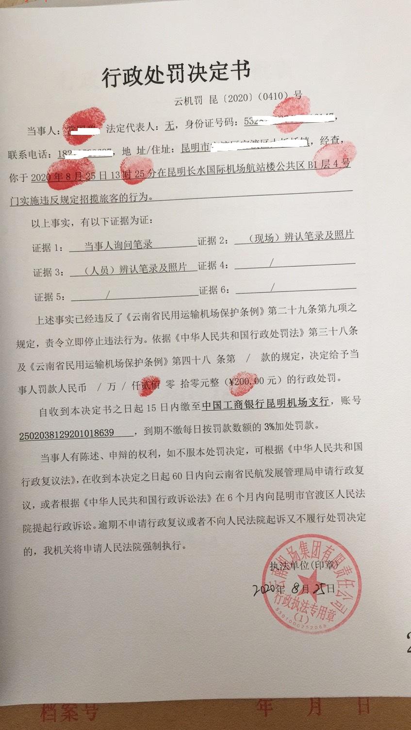 行政处罚决定书 云机罚 昆{2020} (0410)号