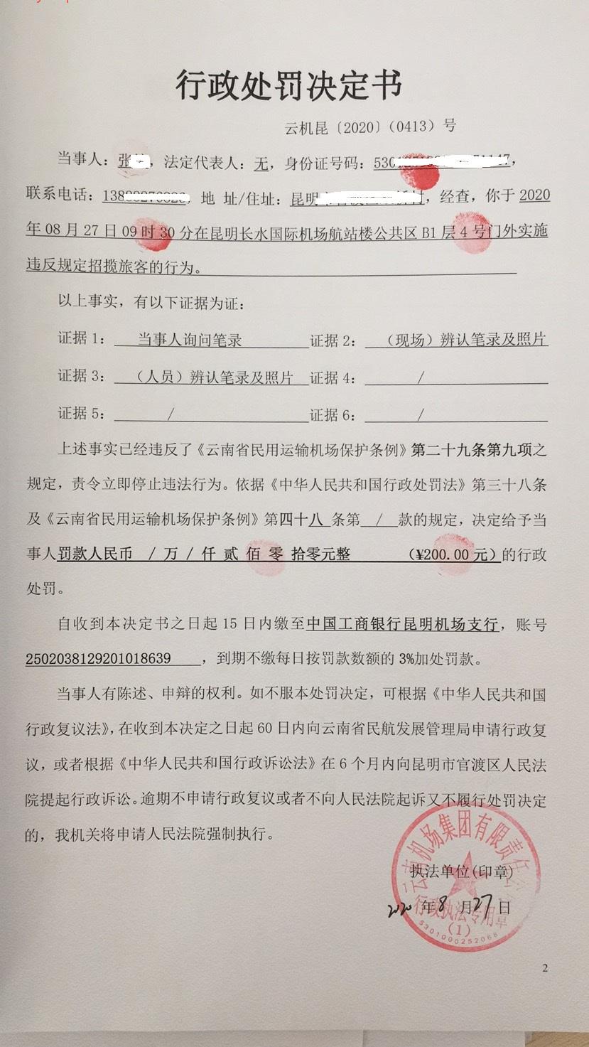 行政处罚决定书 云机罚 昆{2020} (0413)号