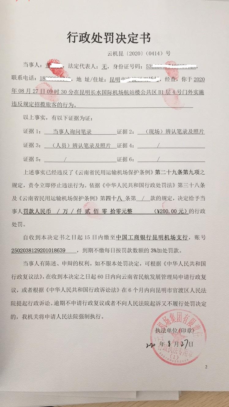 行政处罚决定书 云机罚 昆{2020} (0414)号