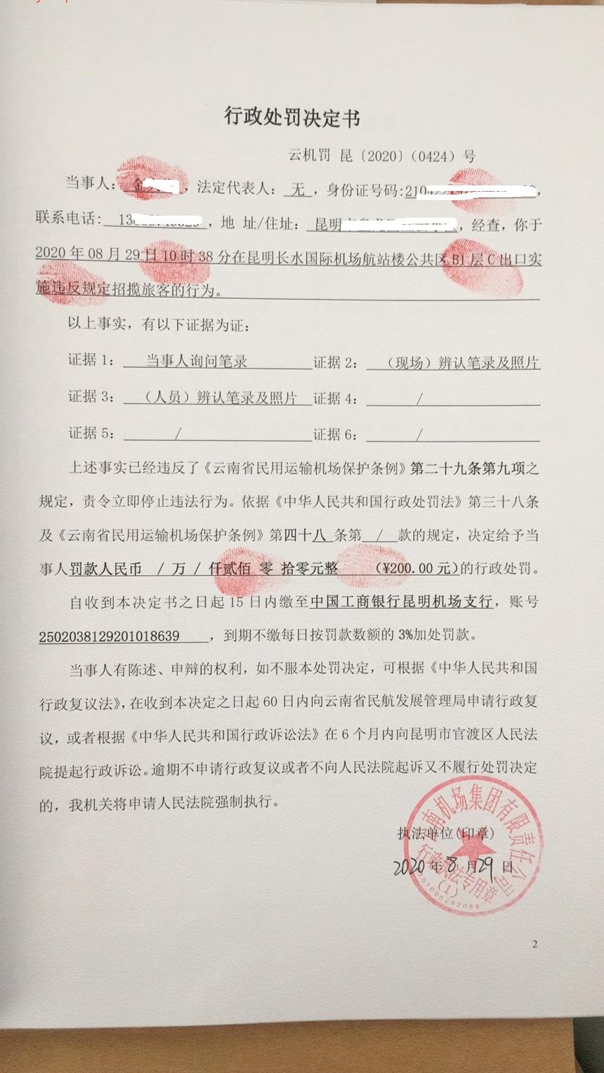 行政处罚决定书 云机罚 昆{2020} (0424)号