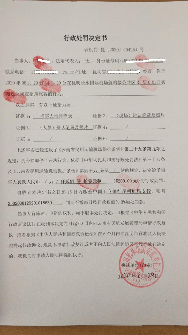 行政处罚决定书 云机罚 昆{2020} (0426)号