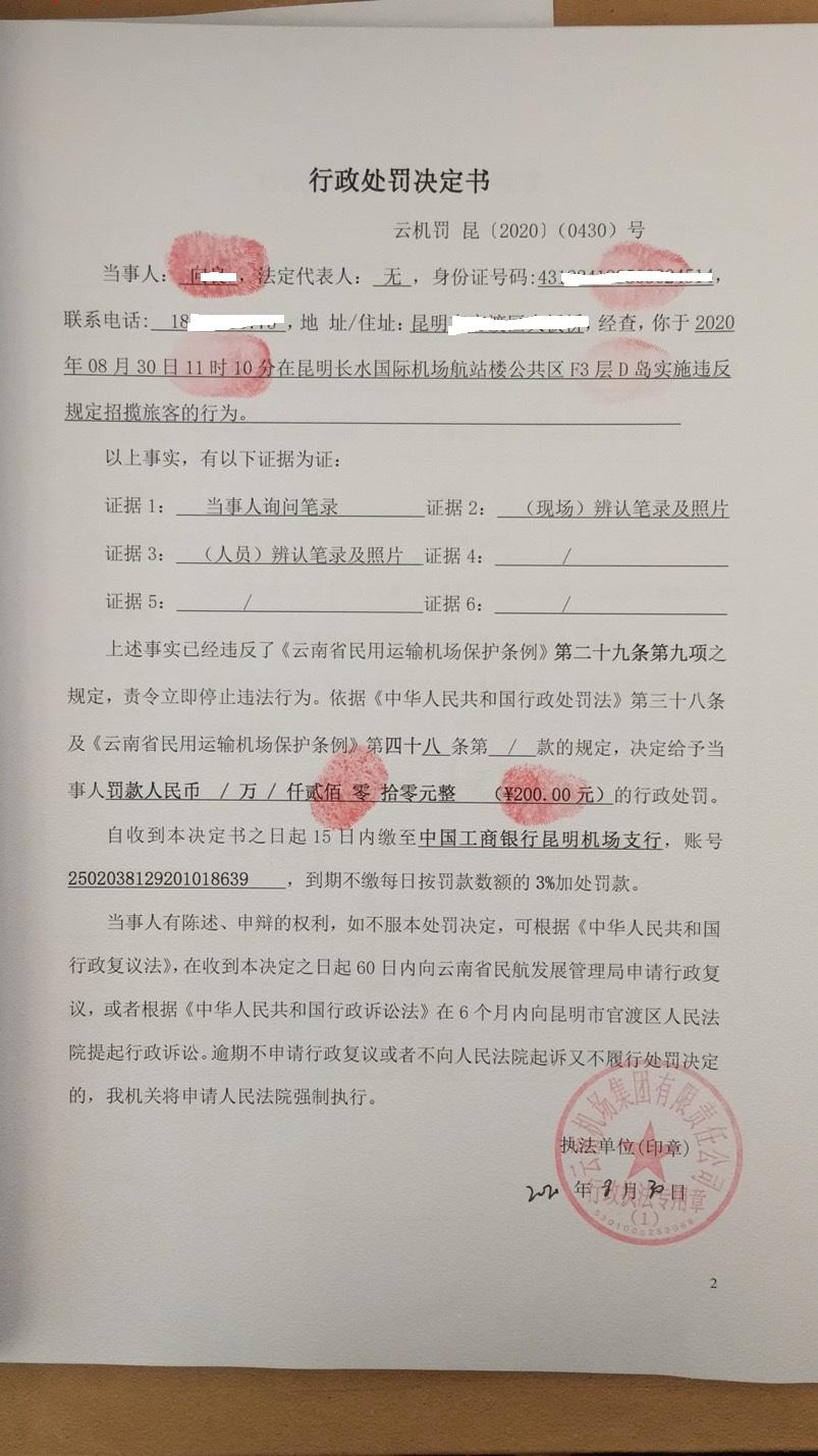 行政处罚决定书 云机罚 昆{2020} (0430)号