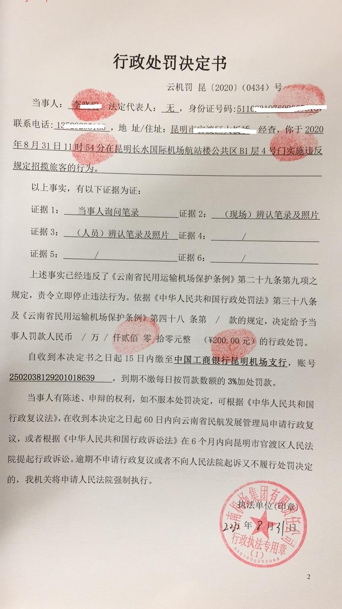 行政处罚决定书 云机罚 昆{2020} (0434)号