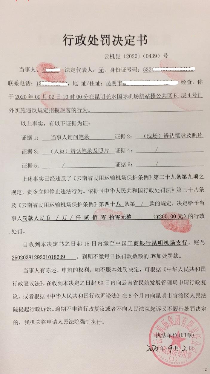 行政处罚决定书 云机罚 昆{2020} (0438)号