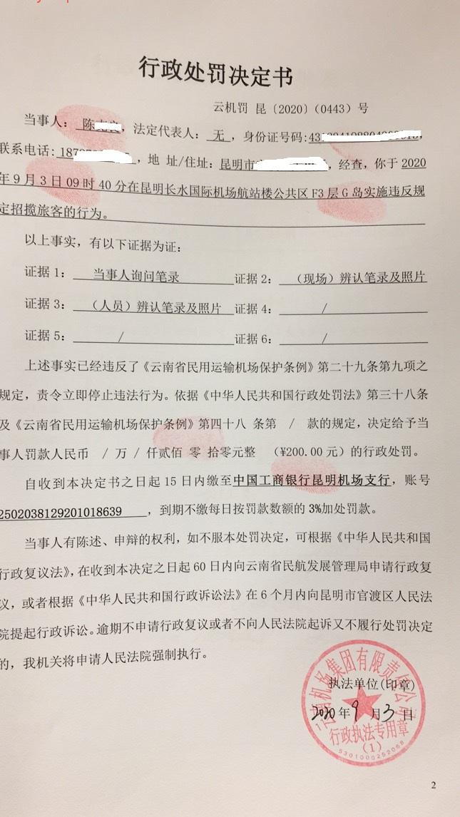 行政处罚决定书 云机罚 昆{2020} (0443)号